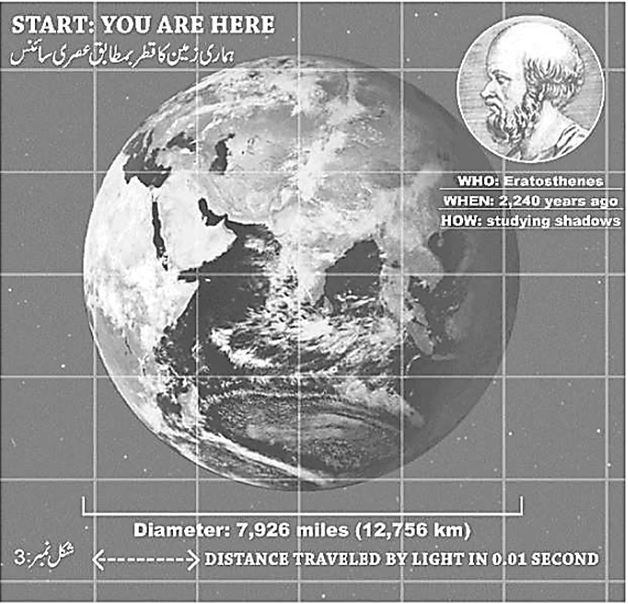 اب ہم “Big Bang” سے زمین کی طرف آتے ہیں جو کہ ہمارا مسکن ہے۔ ”زمین گول ہے“ کا تصور زمانہ قدیم سے رائج ہے انسانی ارتقاء کے ساتھ ساتھ ان تصورات میں مزید اضافہ ہوا 2500 سال پہلے ایک یونانی سیاح نے شمال سے جنوب تک کا سفر کرتے ہوئے آسمان پر نظر آنے والے ستاروں کے جھرمٹوں کے نقشے بنائے جن سے یہ ثابت ہوا کہ تمام کے اعتبار سے زمین سے نظر آنے والے ستاروں کے جھرمٹ مختلف ہوتے ہیں اس سے یہ نتیجہ اخذ کیا گیا زمین کے اطراف میں ستاروں کے مختلف جھرمٹ ہیں۔ اس کے ساتھ ہی چاند گرہن کے دوران زمین کے گول سائے نمودار ہونے سے اس دعویٰ کی بھی تصدیق کر دی گئی کہ زمین گول ہے۔ حتیٰ کہ کچھ صدیوں کے بعد Eratosthenes نے زمین کے محیط کو ناپنے کے لئے سورج کے سائے کو زمین پر مختلف مقامات پر پیمائش کیا جن کا آپس میں فاصلہ کئی سو میل تھا۔ اس تجربہ سے اُس نے ثابت کیا کہ زمین کا محیط معلوم کیا جا سکتا ہے۔ موجودہ سائنس کے مطابق زمین کا قطر 12,756 کلو میٹر ہے جیسا کہ شکل نمبر 3 میں دکھایا گیا ہے۔ اسی طرح جیومیٹری کے فارمولوں کی مدد سے زمین کی گولائی نکالی جا سکتی ہے جو کہ تقریباً 40, 079 کلو میٹر ہے کائناتی نظام میں فاصلہ کو ناپنے کے لئے روشنی کی رفتار کو پیمانے کے طور پر استعمال کیا جاتا ہے۔ روشنی کی رفتار 300,000 کلو میٹر فی سیکنڈ بتائی جاتی ہے یعنی اس رفتار سے زمین کے گرد ایک سیکنڈ میں تقریباً 7 چکر لگ سکتے ہیں۔